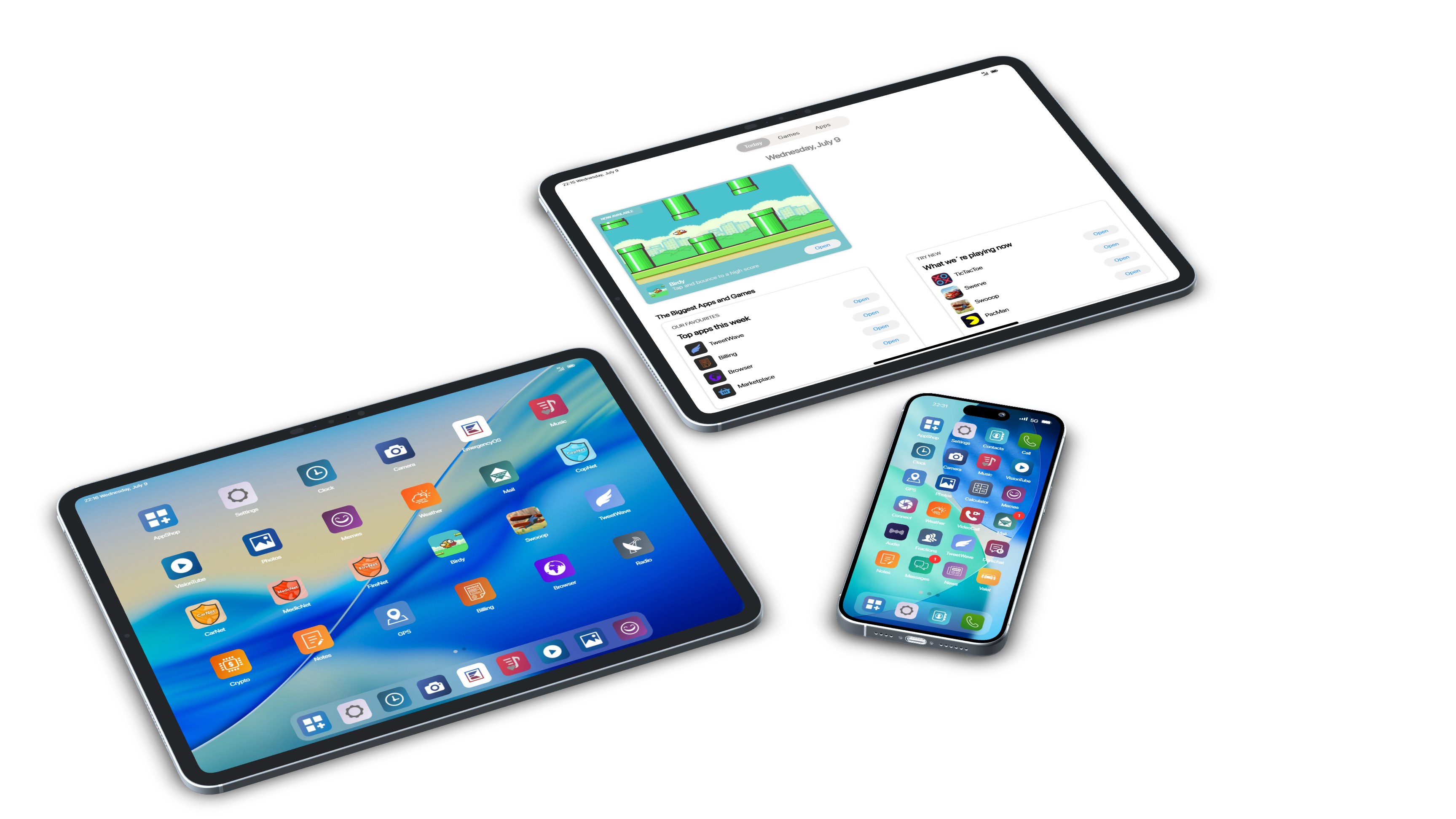 Apps & Communication: AppStore, Calls, VideoCalls, Contacts, Notes, Messages (Groups, Emojis, Voicemail) Livestream App (broadcast anytime) Banking & Crypto (realtime updates) Photos, VisionTube, Music (100M+ songs), Dating, Memes GPS, Clock, Service/Dispatch, Anonymous Calls, Group Calls Valet, Weather, News, Taxi Service Media & Audio: 30,000+ Radio Stations worldwide available 100+ Million Songs available in the phone Music audible to nearby players Playlist feature available with RoadPods Flashlight sync, wallpapers, voice memos Games: Swerve, FlappyBird, DoodleJump, Pacman, TicTacToe, 2048 Customization: Add unlimited custom apps or website apps 6 phone models in multiple colors Full layout saving, drag & organize apps